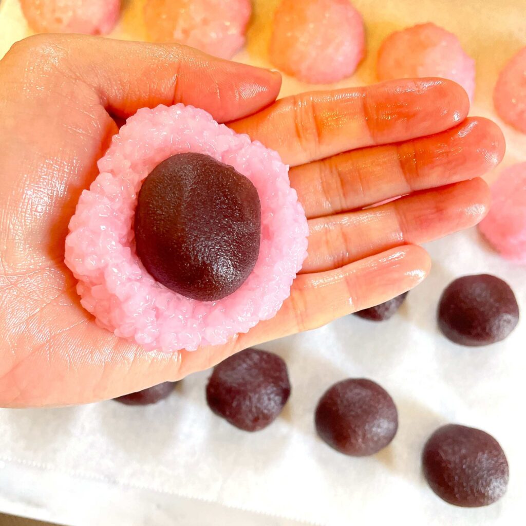 次に、道明寺粉の生地を少し平べったく伸ばし、あんこを包みます。