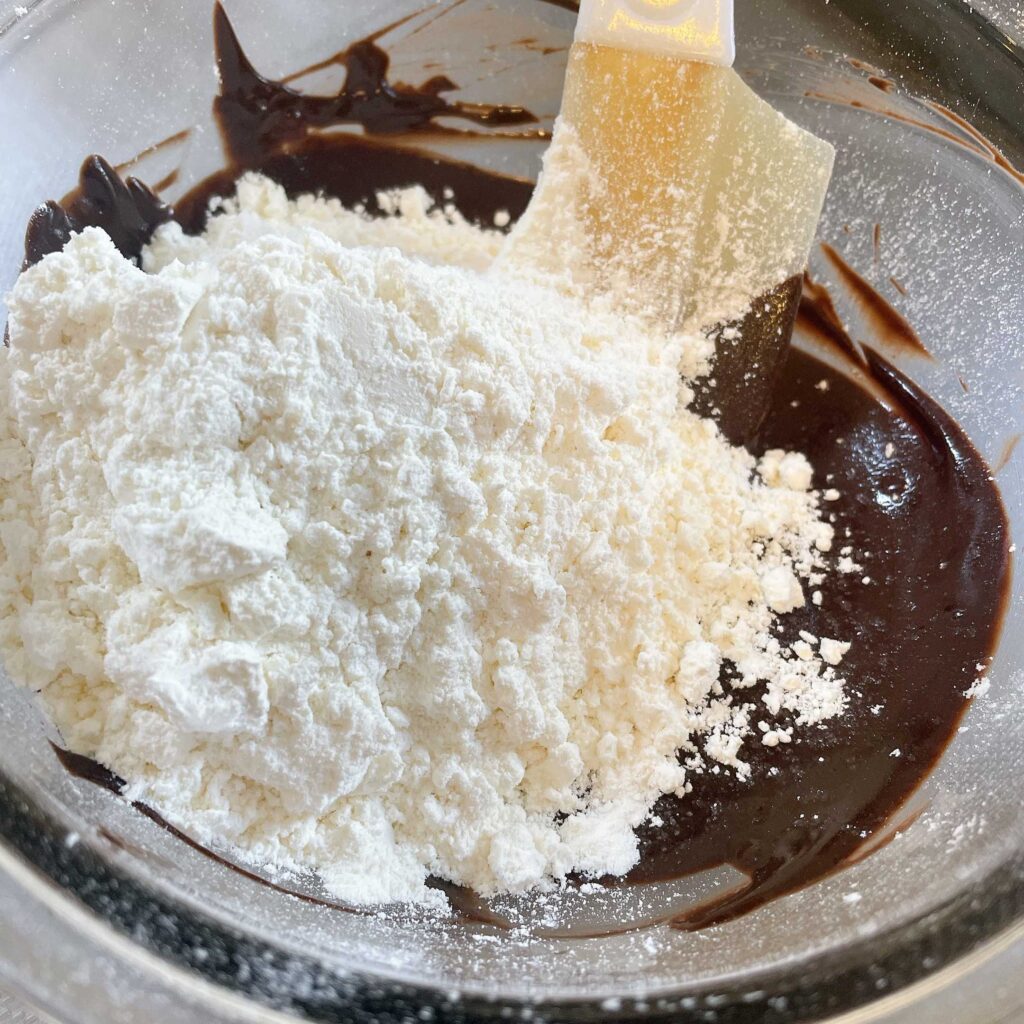 溶けたチョコに薄力粉をふるい入れます。 あとは、粉っぽさがなくなるまでゴムベラでさっくり混ぜるだけ。