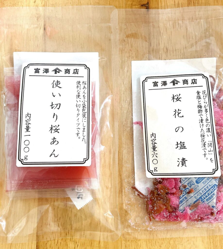 今回の仕上げに使う、桜あん、ストロベリーチョコ、桜の塩漬けはすべて富澤商店オンラインショップで購入しました。