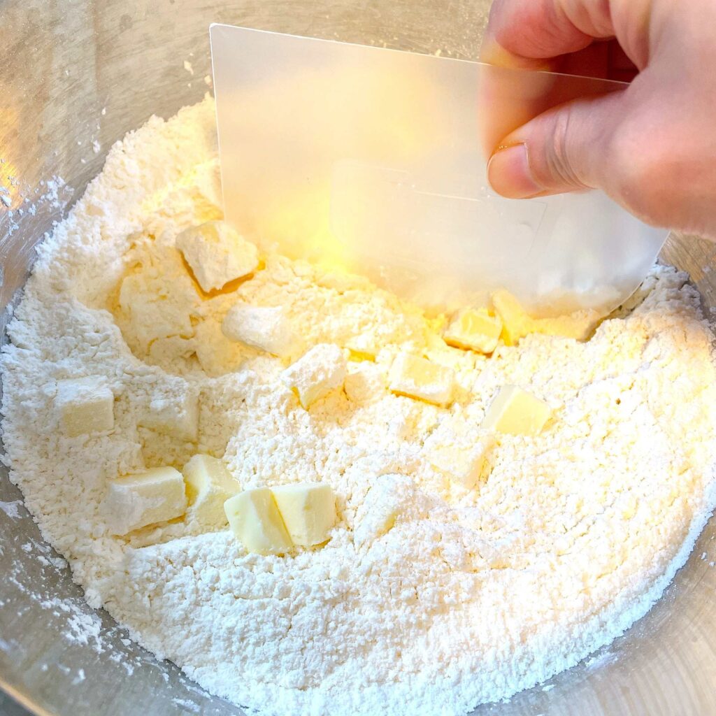 冷蔵庫から出したての冷たいバターを1㎝角くらいにカットして投入します。ゴムベラやカードでバターを細かく切るように混ぜます。