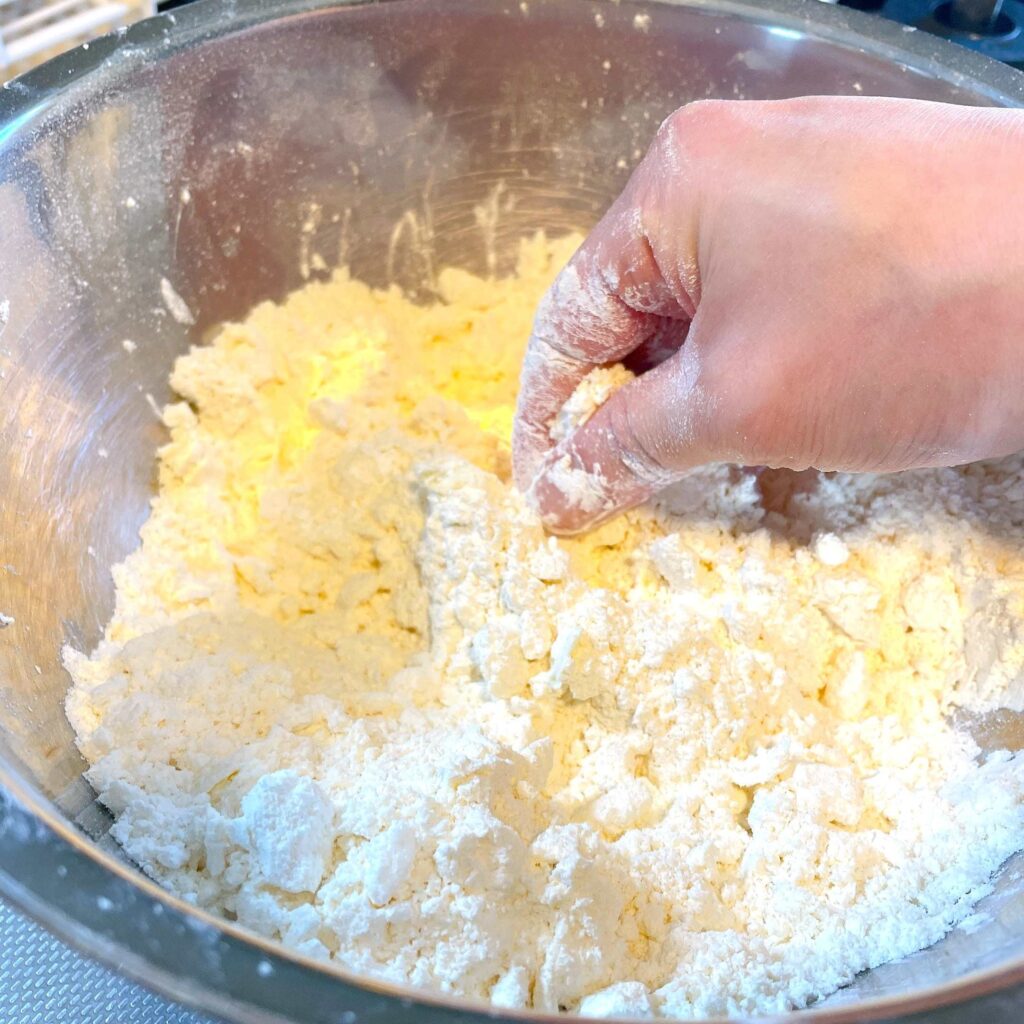 ある程度細かくなったら、指先でバターをちぎりながら粉となじませていきましょう。