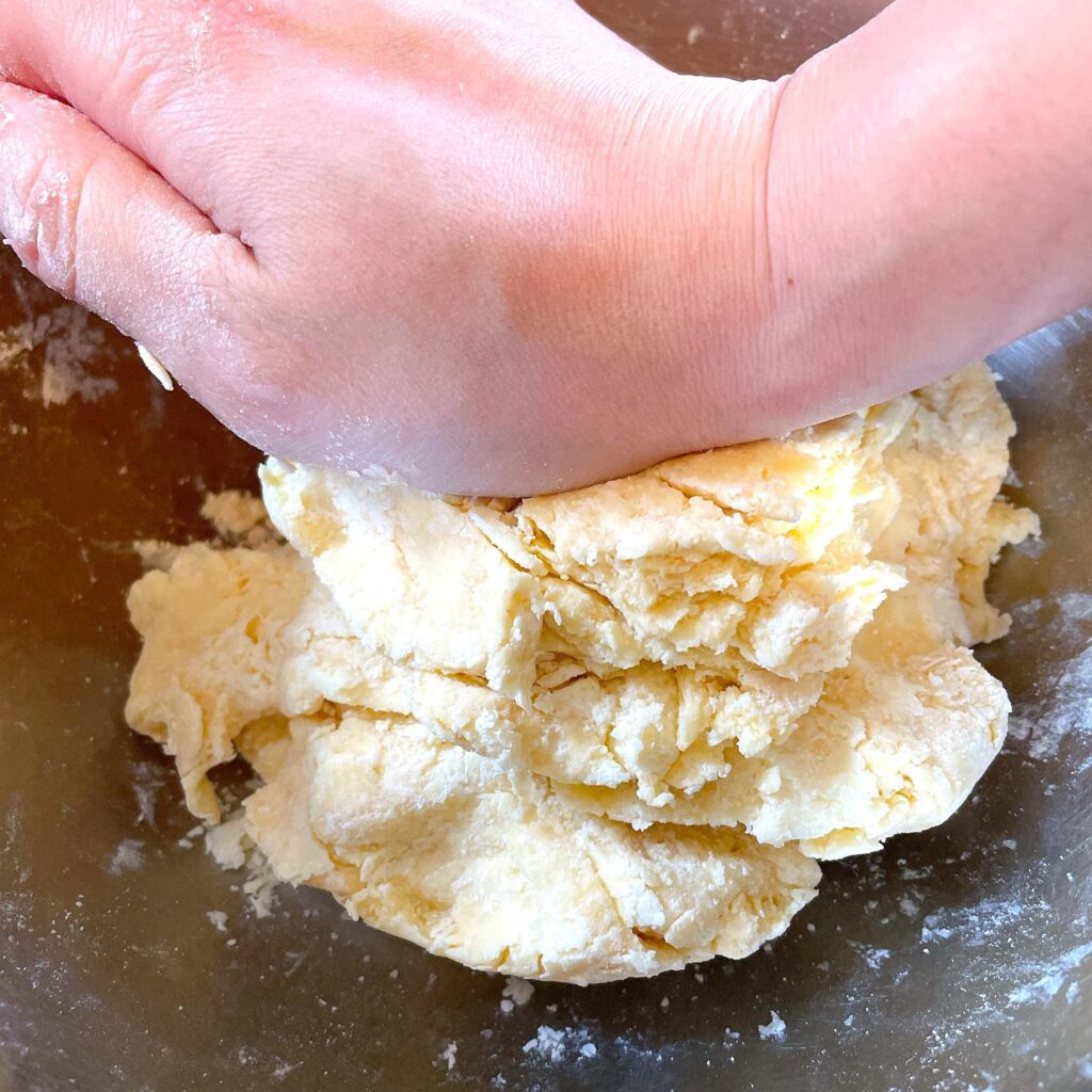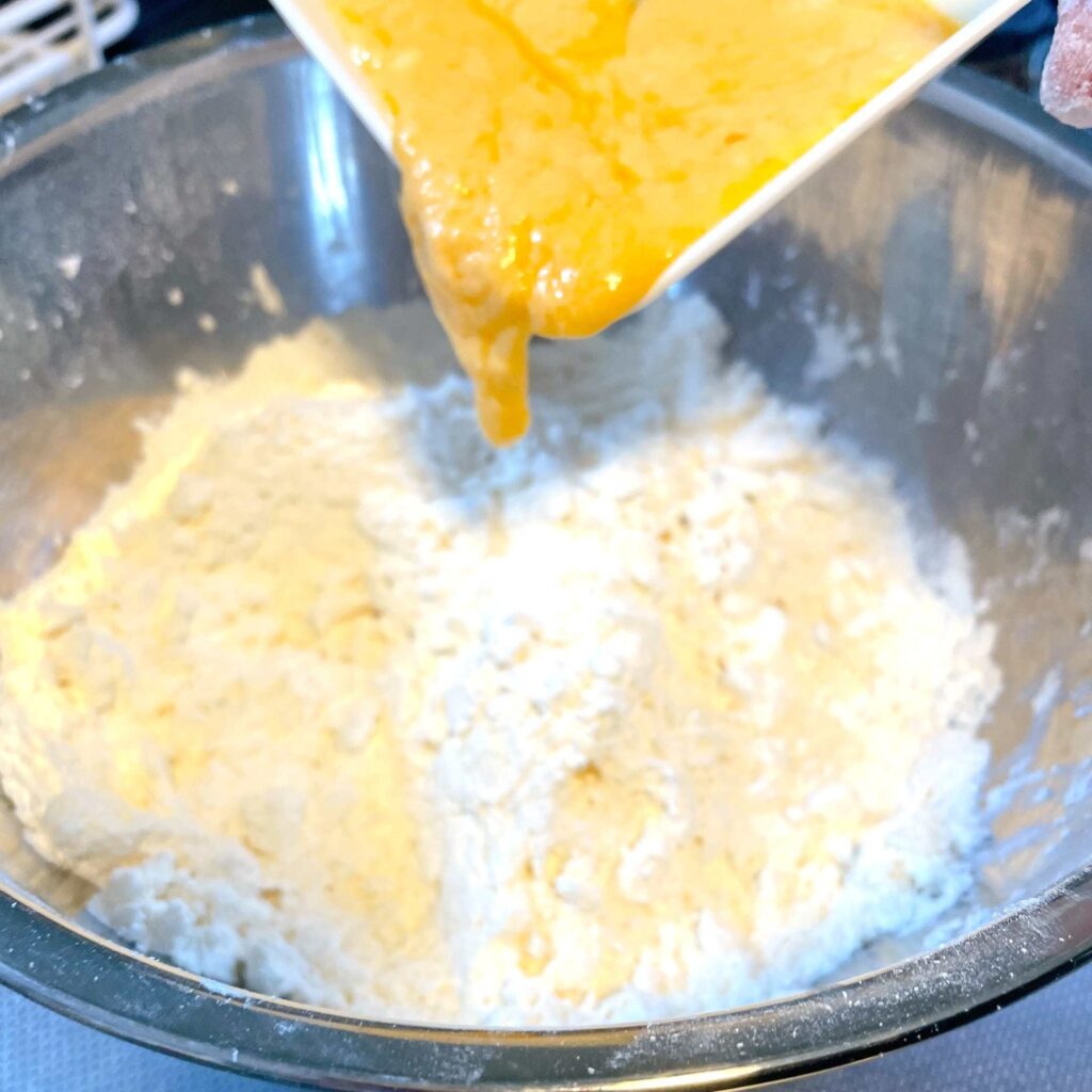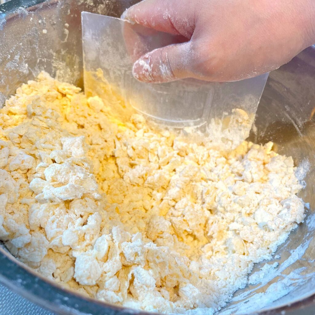 ヘラやカードで切るように混ぜ、粉っぽさが少し残っているくらいで、手でまとめていきます。