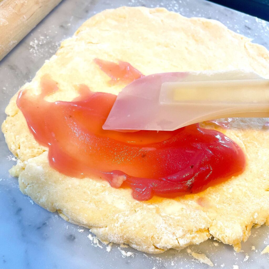 ここで主役の「桜あん」登場。生地の半分に塗り広げ、生地を2等分にして重ねます。