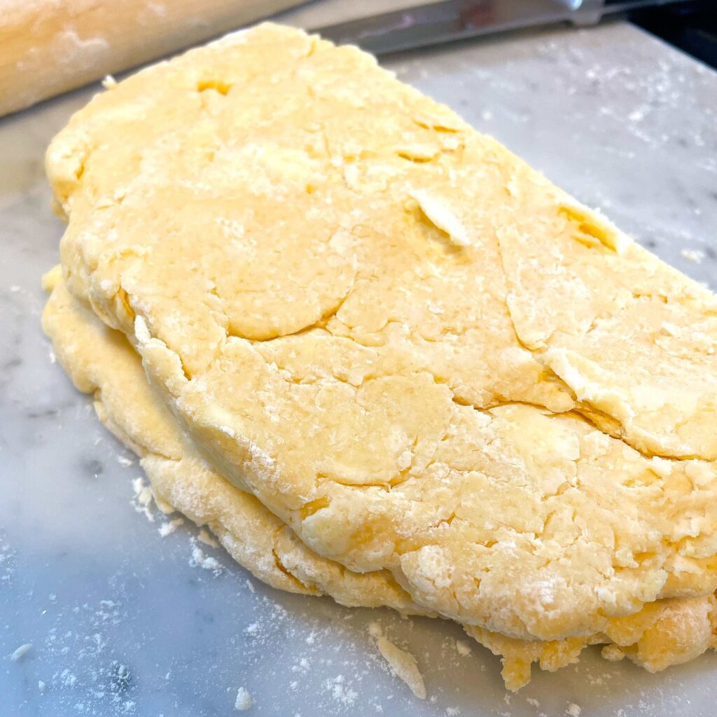 粉類、砂糖、塩、バターをフードプロセッサーに入れ、バターが細かくなりある程度粉と合わさったら、牛乳と卵を入れる。少し粉っぽさが残る程度にまとまれば、ボウルに移して手で重ねる作業に移りましょう!