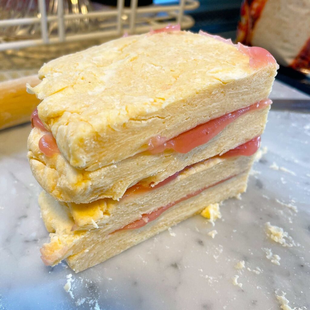さらに半分に桜あんを塗り広げ、カットして重ねます。