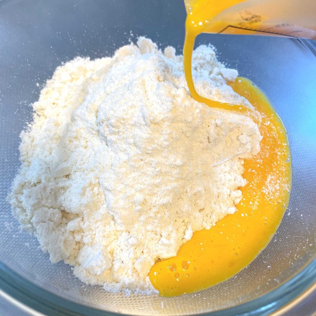ボウルにミックス粉とよくかき混ぜた卵を投入。