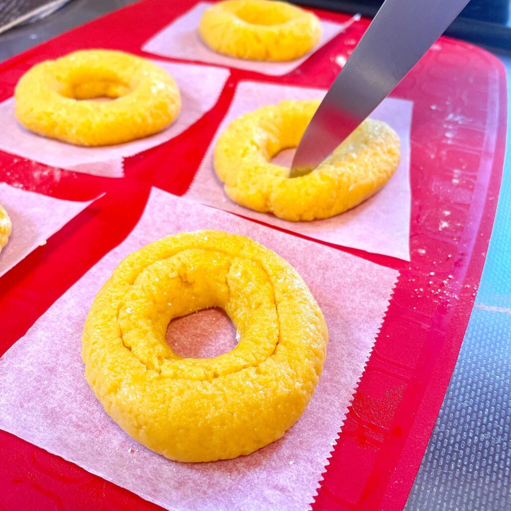 成型した生地をクッキングシートにのせ、表面に包丁で切り込みを入れたら揚げの工程へ。
