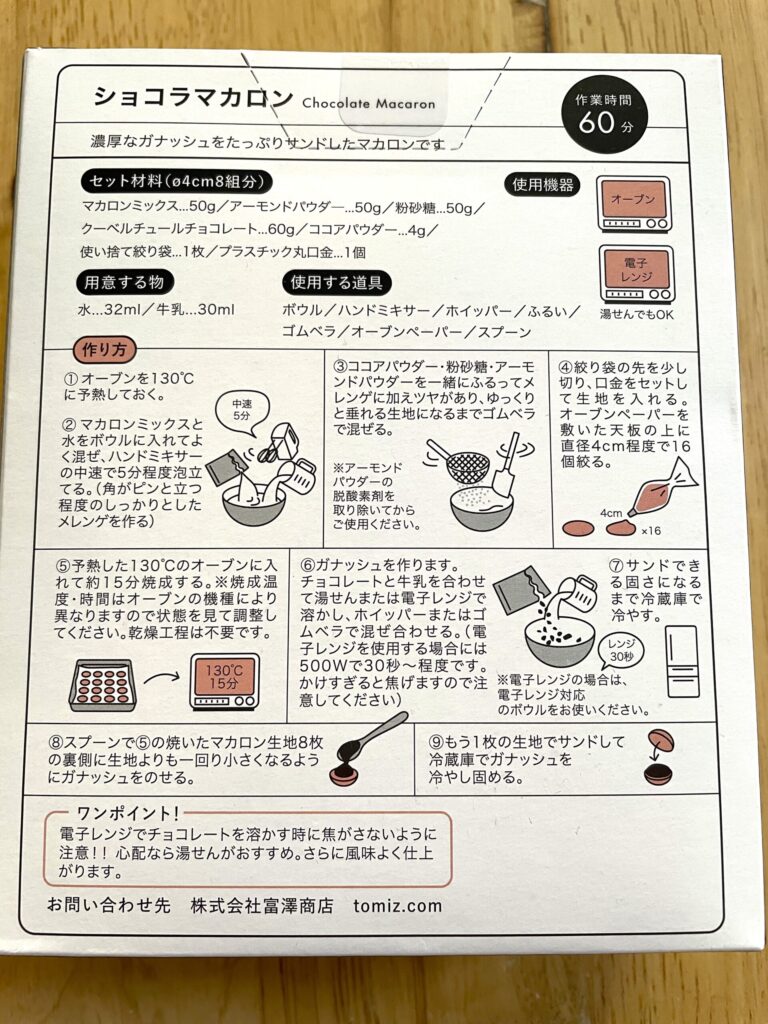 そして、本来のマカロン作りでは綺麗なピエ(マカロン生地の側面のヒダヒダ部分のこと)を作るために表面を乾燥させる時間が必要なんですが、こちらのキットでは乾燥不要とのこと。