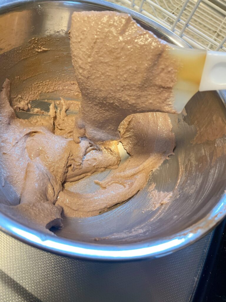 お次は…アーモンドパウダー、ココアパウダー、粉砂糖をふるい入れてゴムベラで混ぜていきます。